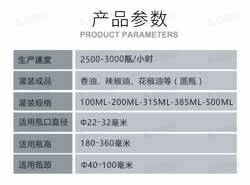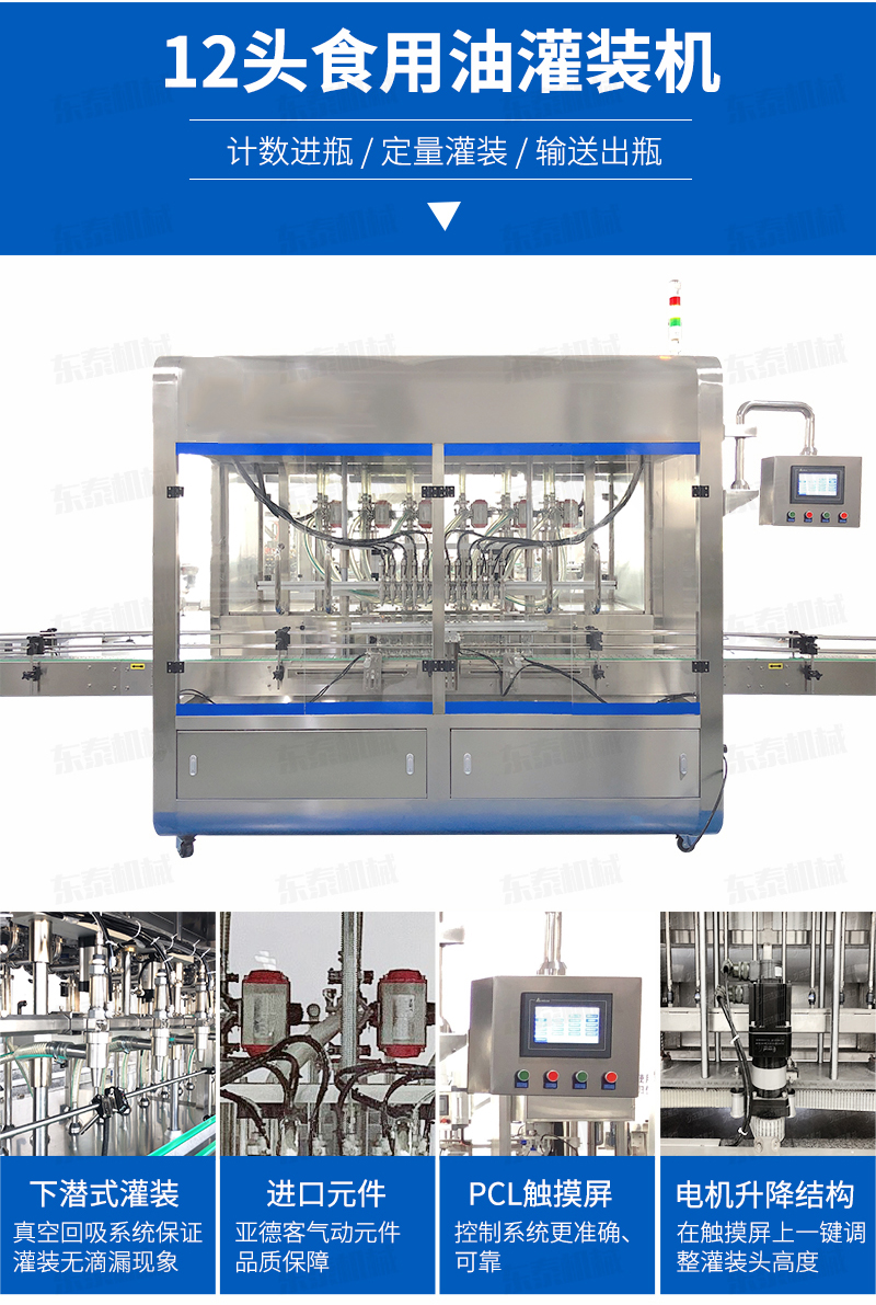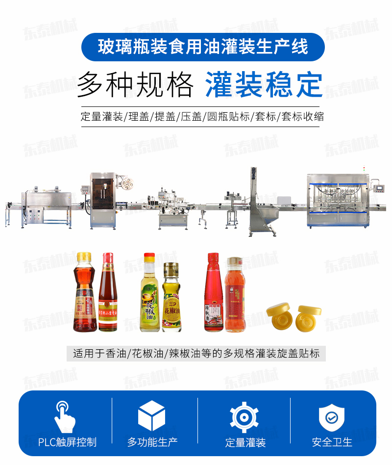 灌裝機簡述 該系列灌裝機采用容積式計量灌裝原理,適用于各種規(guī)(100ml-1000ml)的南瓜籽油、榛子油、牡丹籽油、芝麻油、核桃油、山茶油、亞麻籽油、棉籽油、橄欖油、大豆油、玉米油