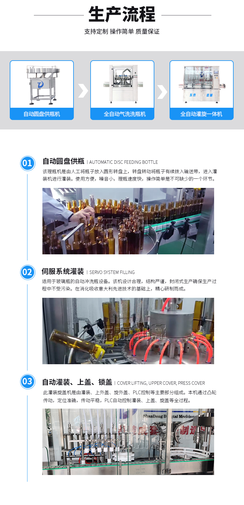 本灌裝流水線設(shè)備具有穩(wěn)定可靠、自動(dòng)化水平高,相比同類產(chǎn)品有著更長(zhǎng)的使用年限,維護(hù)簡(jiǎn)單,整線中各設(shè)備的協(xié)調(diào)性、連貫性強(qiáng),整線設(shè)計(jì)合理等特點(diǎn)。灌裝設(shè)備采用獨(dú)家專利系統(tǒng)結(jié)構(gòu),為當(dāng)今行業(yè)內(nèi)水平,整