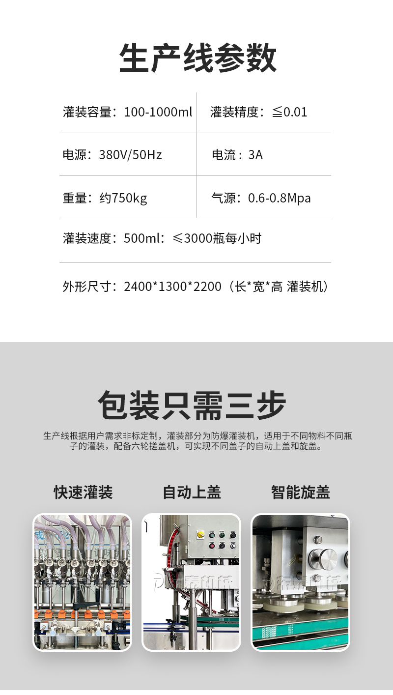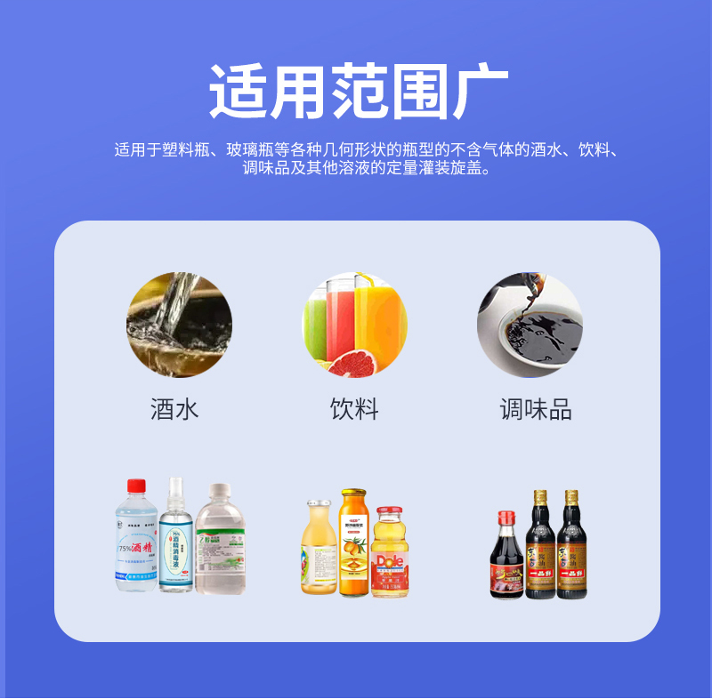 電子量杯感應(yīng)直列式灌裝機(jī),是目前國內(nèi)液體灌裝的高端產(chǎn)品,自動化程度高,灌裝計量精確,適用于塑料瓶、玻璃瓶等各種幾何形狀的瓶型的不含氣體的酒水、飲料、調(diào)味品及其他溶液的定量灌裝。機(jī)器采用觸摸