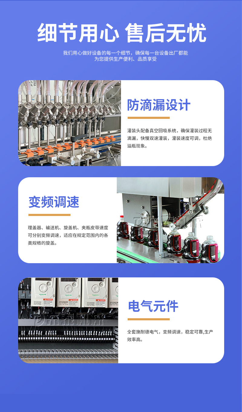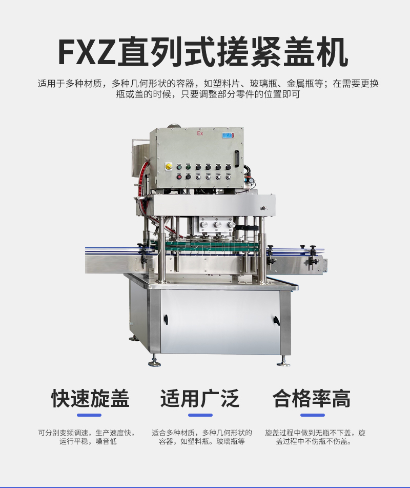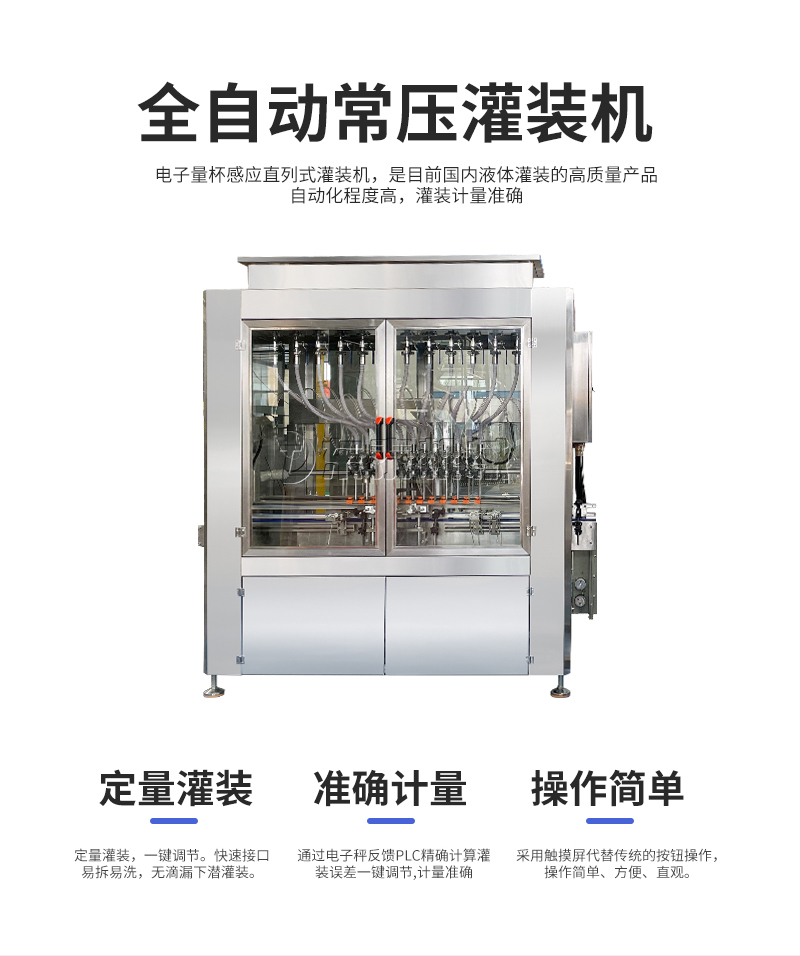 電子量杯感應(yīng)直列式灌裝機(jī),是目前國內(nèi)液體灌裝的高端產(chǎn)品,自動化程度高,灌裝計量精確,適用于塑料瓶、玻璃瓶等各種幾何形狀的瓶型的不含氣體的酒水、飲料、調(diào)味品及其他溶液的定量灌裝。機(jī)器采用觸摸屏代替?zhèn)鹘y(tǒng)的按鈕操作,操作簡單、方便、直觀?萍己扛。機(jī)器灌裝計量可通過觸摸屏對灌裝時間的調(diào)整實現(xiàn)不同計量灌裝,方便操作者使用。