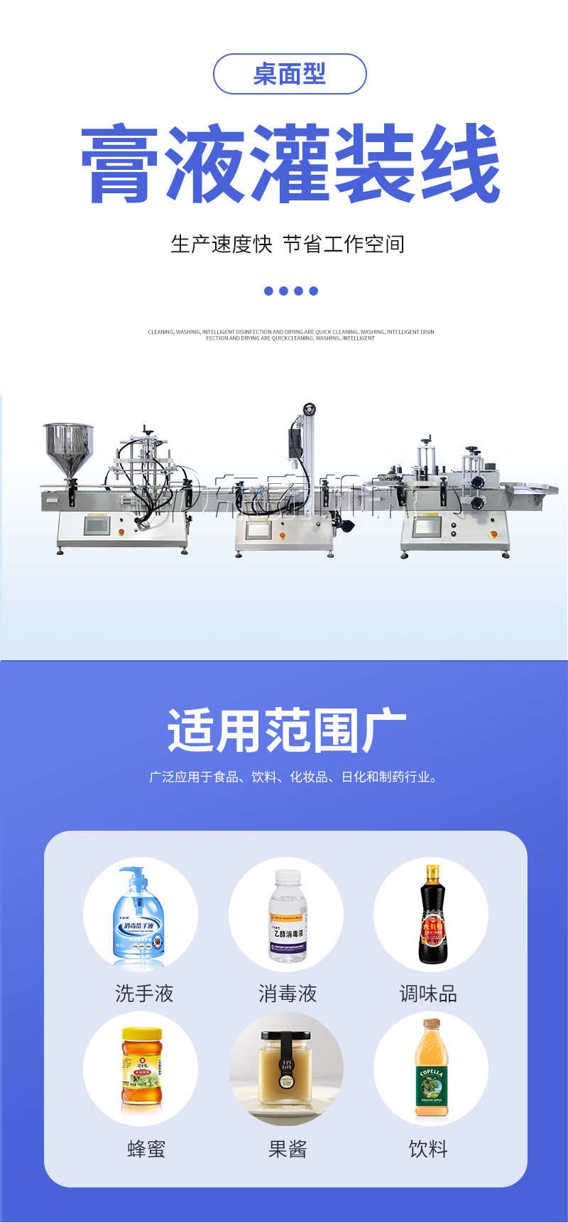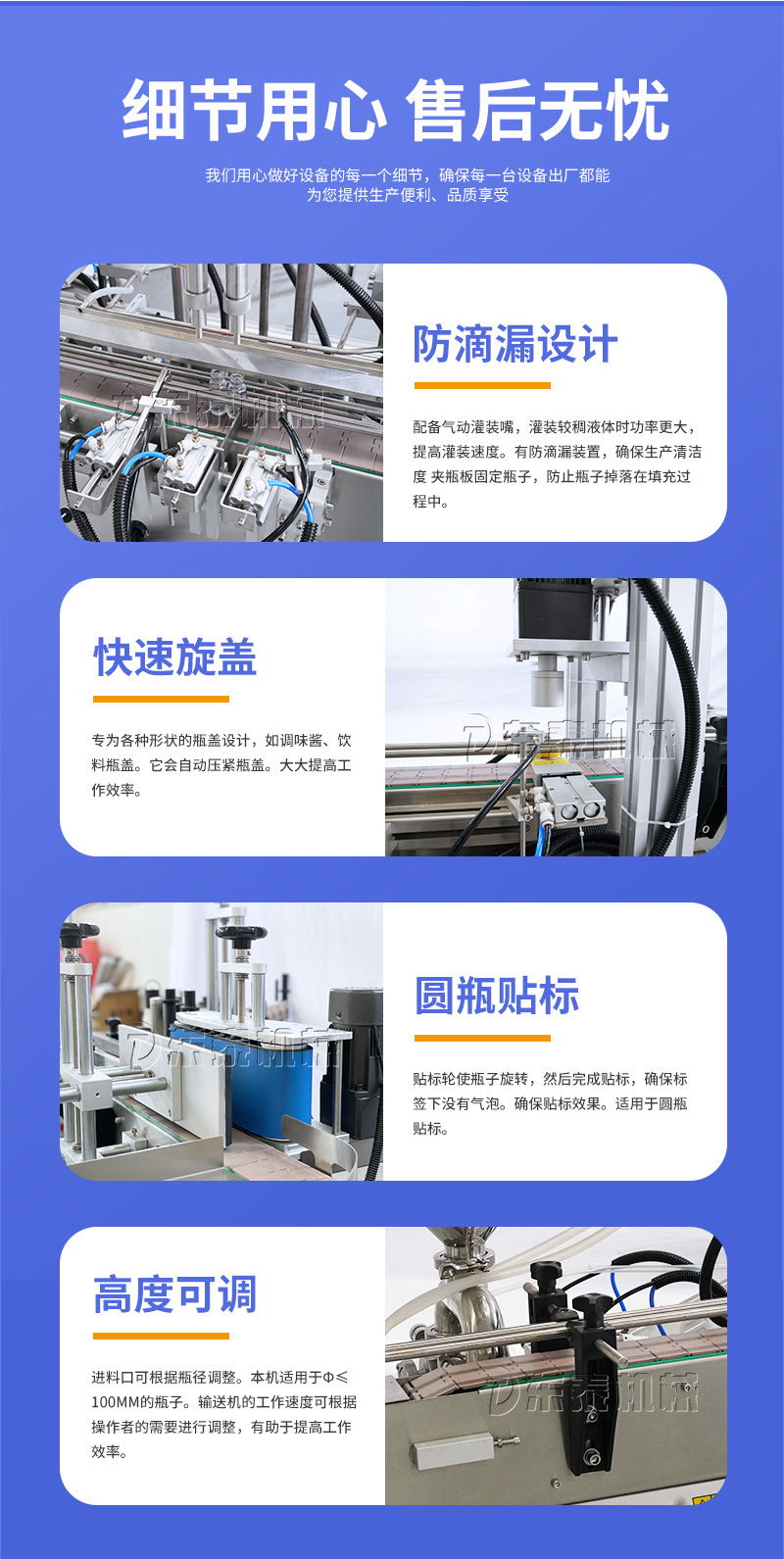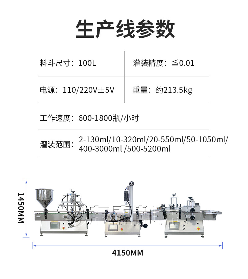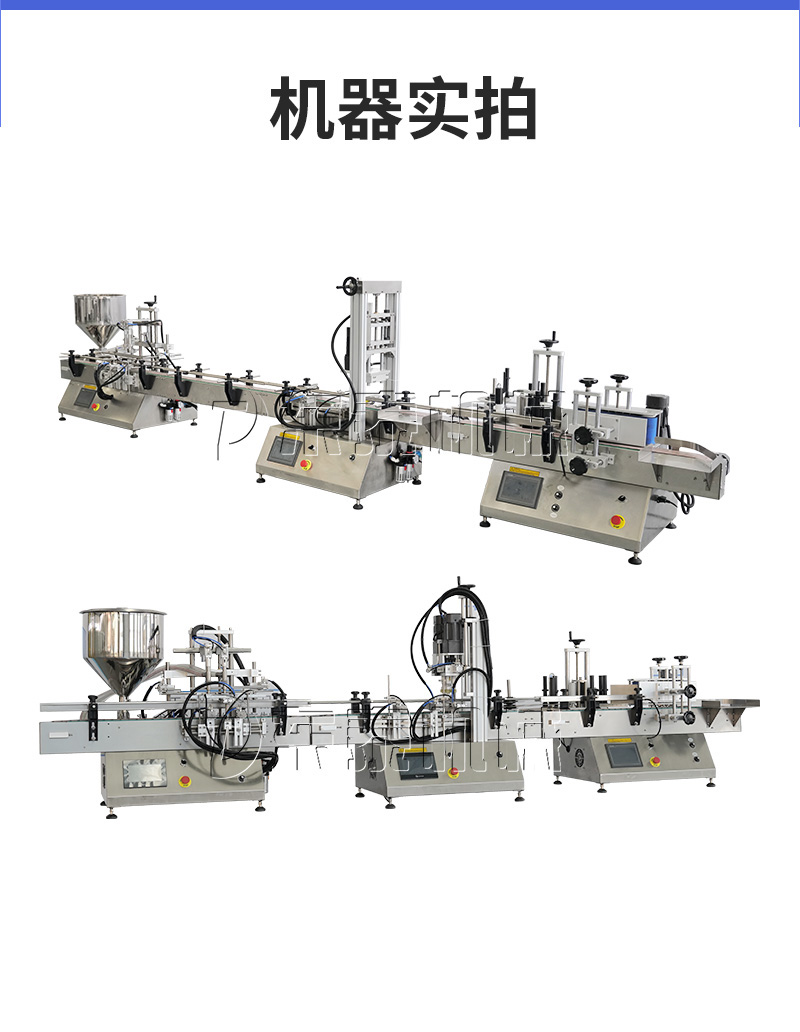 產(chǎn)品說(shuō)明:生產(chǎn)線根據(jù)灌裝范圍選擇型號(hào),灌裝部分為雙頭下潛式灌裝機(jī),適用于不同物料不同瓶子的灌裝,配備自動(dòng)壓蓋機(jī)和圓瓶貼標(biāo)機(jī),可實(shí)現(xiàn)不同蓋子的旋蓋貼標(biāo)工作。 本設(shè)備主要適用于食品、日;
