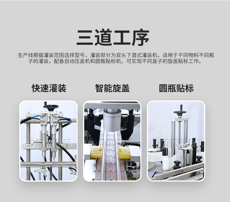 產(chǎn)品說(shuō)明:生產(chǎn)線根據(jù)灌裝范圍選擇型號(hào),灌裝部分為雙頭下潛式灌裝機(jī),適用于不同物料不同瓶子的灌裝,配備自動(dòng)壓蓋機(jī)和圓瓶貼標(biāo)機(jī),可實(shí)現(xiàn)不同蓋子的旋蓋貼標(biāo)工作。