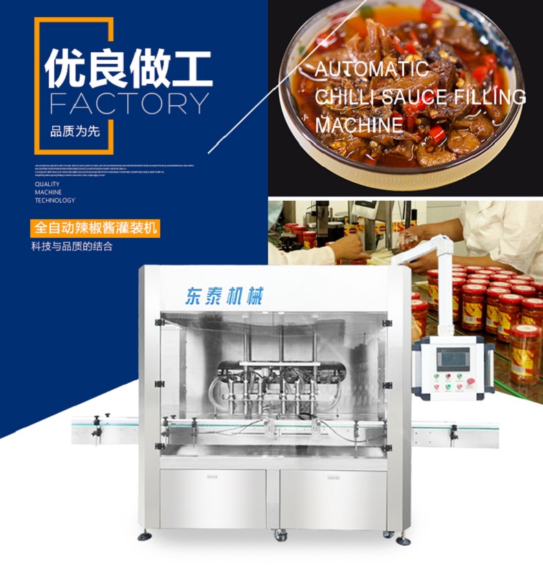全自動(dòng)辣椒醬類醬體灌裝生產(chǎn)線作為公司新研發(fā)的灌裝設(shè)備在市場上起到了關(guān)鍵性的作用,獨(dú)特的技術(shù)讓整個(gè)包裝市場變得富有生命力,是集光,機(jī),電,氣于一體,采用活塞式定量原理,灌裝精度高,操作簡單,維護(hù)方便,設(shè)備主要材質(zhì):采用SUS304不銹鋼制造,符合衛(wèi)生要求.灌裝過程采用亞克力透明板與外界隔離,保證灌裝的衛(wèi)生要求。灌裝采用壓力式灌裝,無需配裝高位罐,簡化了安裝工序,提高了灌裝效率。可廣泛應(yīng)用于食品、醬料行業(yè)產(chǎn)品的自動(dòng)化包裝生產(chǎn)。幾乎能夠灌裝所有醬類、醬料物體是該款全自動(dòng)辣椒醬類醬體灌裝生產(chǎn)線最大的優(yōu)勢,包括大塊肉醬、顆粒醬、濃醬、豆瓣醬、甜面醬、辣椒醬等。