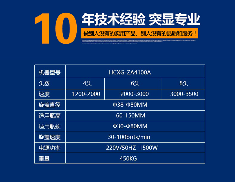 產(chǎn)品技術(shù)參數(shù) 機(jī)器型號(hào):HCXG-ZA4100A 頭數(shù):2 速度:1200-2000次/時(shí) 旋蓋直徑:38-80mm 適用瓶高:60-150mm 適用瓶頸:30-80mm 旋蓋速度:30