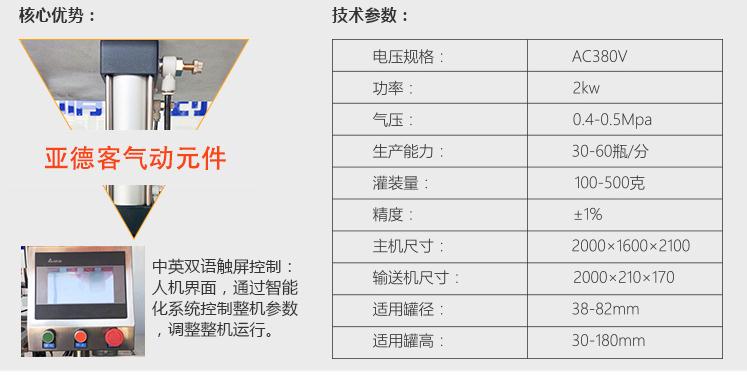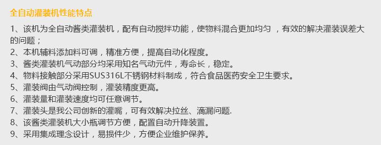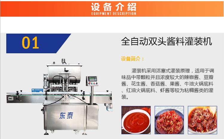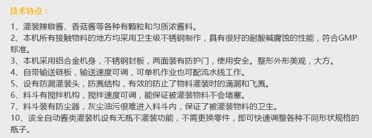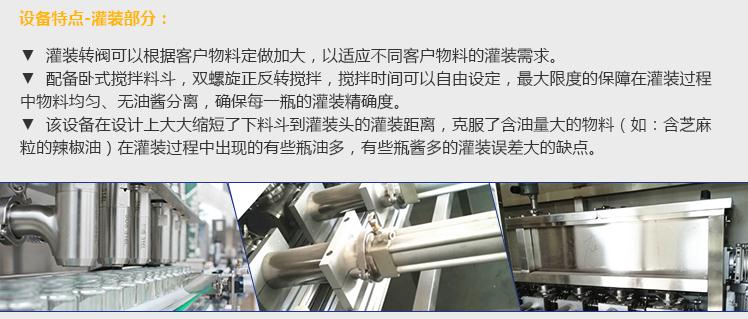 產(chǎn)品簡(jiǎn)介 灌裝機(jī)采用活塞式灌裝原理,適用于調(diào)味品中帶顆粒并且濃度較大的辣椒醬、豆瓣醬、花生醬、香菇醬、果醬、牛油火鍋底料、紅油火鍋底料、蝦醬等較為粘稠醬類(lèi)的灌裝。 產(chǎn)品優(yōu)勢(shì) 1、該機(jī)