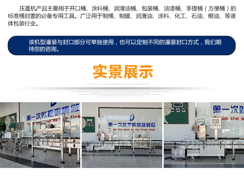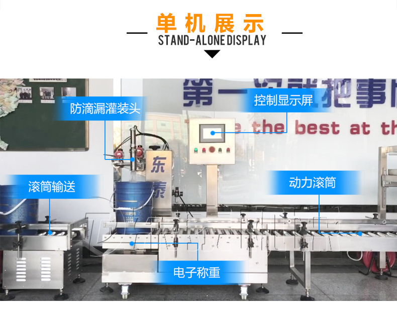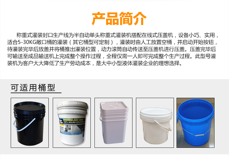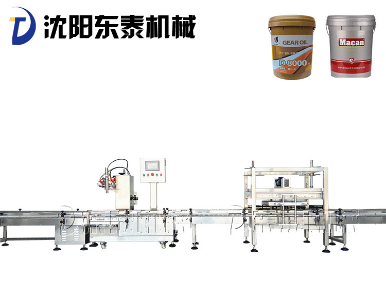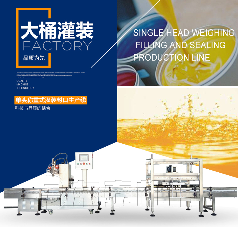 稱重式灌裝封口生產(chǎn)線為半自動(dòng)單頭稱重式灌裝機(jī)搭配在線式壓蓋機(jī),設(shè)備小巧、實(shí)用適合5-30KG敞口桶的灌裝(其它桶型可定制),灌裝時(shí)由人工放置空桶,并啟動(dòng)開(kāi)始按鈕,待灌裝完畢后放蓋并將桶推岀灌裝位置,動(dòng)力滾筒自動(dòng)傳送至壓蓋杋進(jìn)行壓蓋。壓蓋完畢后可輸送至成品輸送機(jī)上完成整個(gè)操作過(guò)程,全程僅需一人即可完成整個(gè)生產(chǎn)過(guò)程。此型號(hào)灌裝機(jī)為客戶大大降低了生產(chǎn)勞動(dòng)成本,是大中小型液體灌裝企業(yè)的理想選擇。